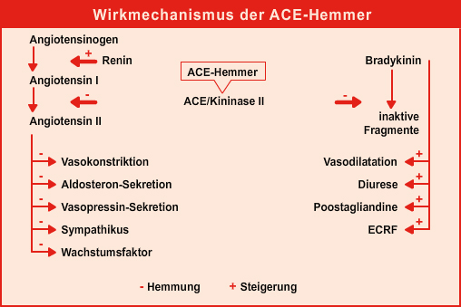 Auch Kallikrein-, Kinin - und das Prostaglandinsystem sind Gegenspieler dieser Kompensationsmaßnahmen. Kallikrein wird durch die Enzyme Kinase I und II zu Bradykininabgebaut. Die Kinase II entspricht dem Angiotensin-Converting-Enzym (ACE). Bradykinin wirkt vasodilatatorisch, diuretisch und steigert die Ausschüttung von Prostaglandin. Prostaglandine hemmen die antinatriuretischen und antidiuretischen Effekte von RAASund Sympathikus.