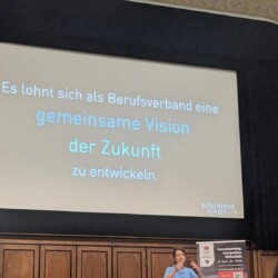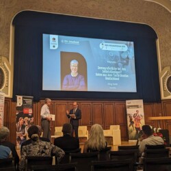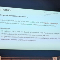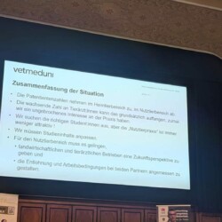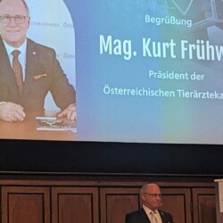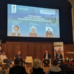 Anschließend gab Prof. Dr. Dr. Matthias Gauly, der neue Rektor der Veterinärmedizinischen Universität Wien, Einblicke in die Zukunft der veterinärmedizinischen Ausbildung in Österreich, da hier ein neues Curriculum in 2026 eingeführt wird. Das bedeutet, in die veterinärmedizinische Ausbildung fließen neue Inhalte ein. Dies sind zum einen Digitalisierung und KI. Zum anderen werden aber auch BWL und gesellschaftliche Kompetenzen, One-Health-Thematiken und Kommunikation sowie SkillsLABs in die Ausbildung integriert. Weiteres Thema seines Vortrags war die Zukunft der Großtierpraxis in Österreich, wie das Interesse der angehenden Tierärzt:innen an der Großtierpraxis erhalten bzw. gestärkt werden kann.