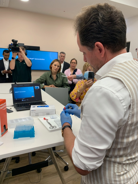 Nach den vielen spannenden Informationen und einer praktischen Vorführung durch Dr. Martin Schröder, Veterinary Specialist Diagnostic, juckt es allen Anwesenden in den Fingern, sie möchten gern selber Hand anlegen. Dr. Julia Gerdes, Tierärztin und Fachredakteurin bei der Schlüterschen, traut sich als Erste, die Blutanalyse mit Hilfe der innovativen Kartusche und dem Gerät in Gang zu setzen. Rasch ist sie von der leichten Bedienung überzeugt. Innerhalb von nur wenigen Minuten erscheinen Bilder und Werte auf dem Monitor.